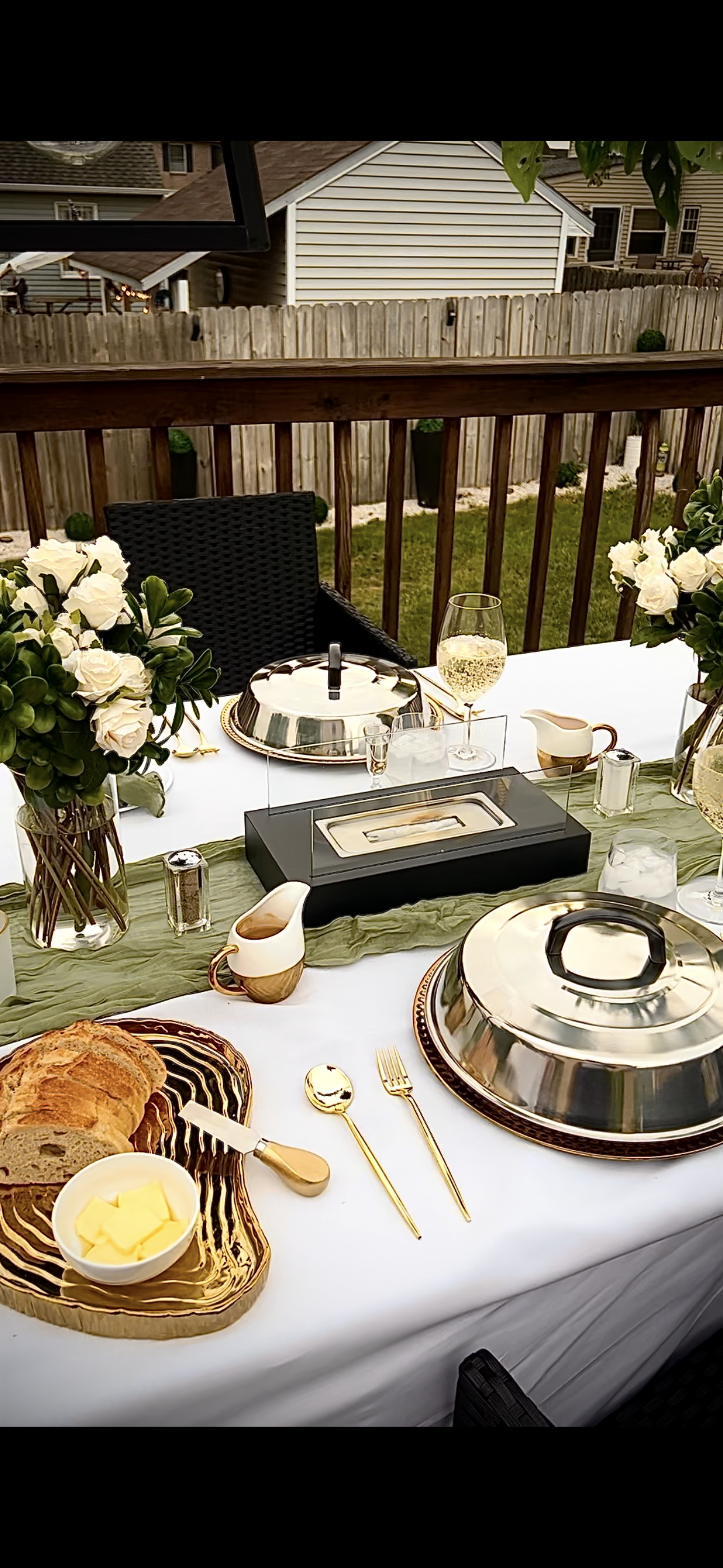 25x28 L shaped deck with modern white and black seating for 22 people. Dining table seats 12, Coupled with two propane fire tables , surrounded by the beautiful lush tropical greenery.